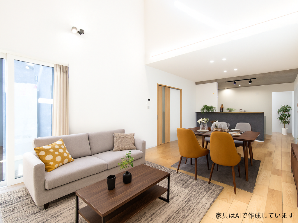 平屋ならではの落ち着きと、開放的な勾配天井が生み出す伸びやかな空間も見どころです。