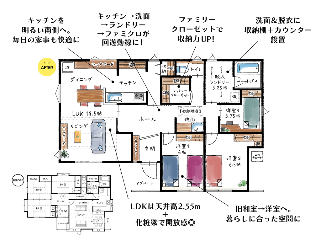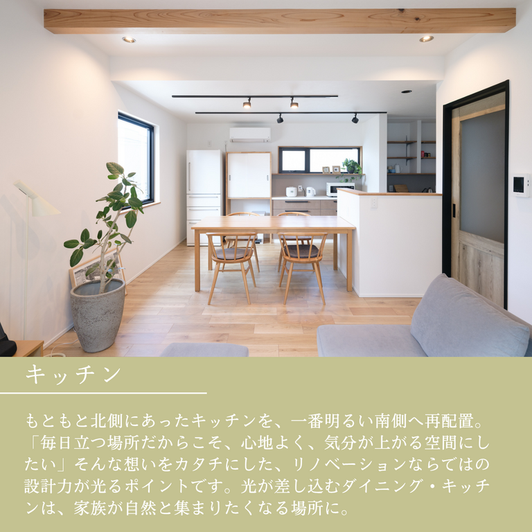 北側にあったLDKを明るい南側へ。毎日の家族が過ごす場所がだからこそ、光と風を感じられる心地良い空間に。以前の間取りを知っているご近所の方も思わず驚くほどの変化です。