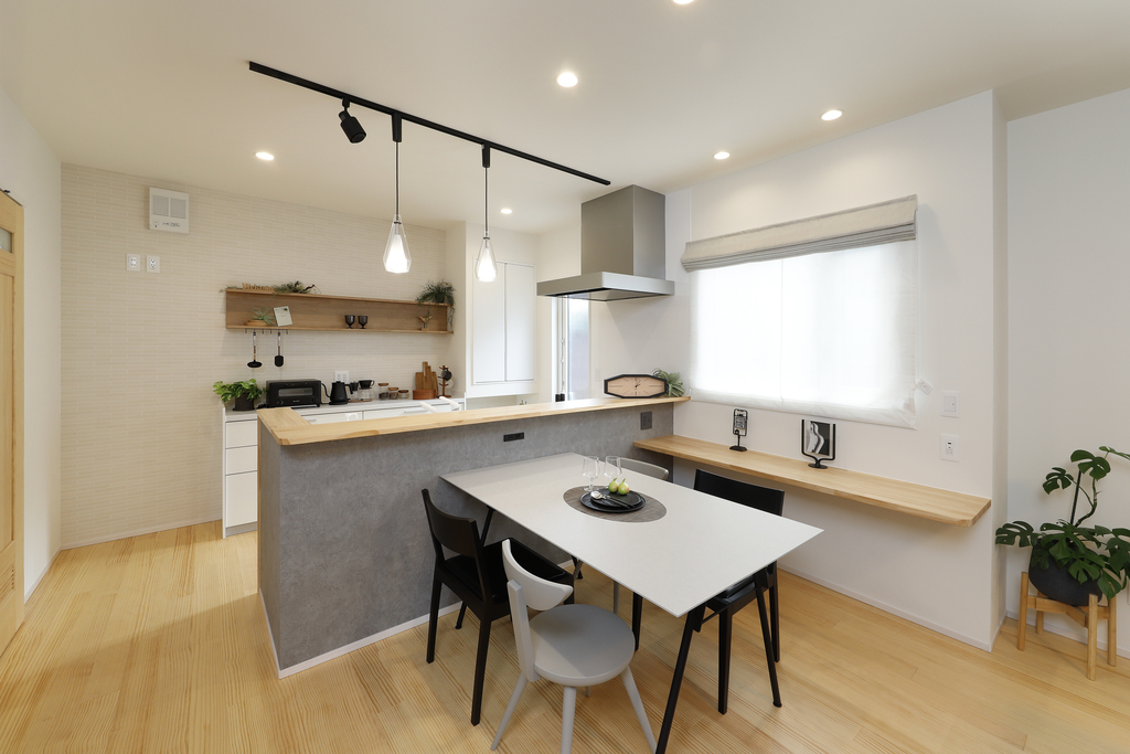 白を基調とした清潔感あるデザインと、機能的なレイアウトでキッチンを中心に