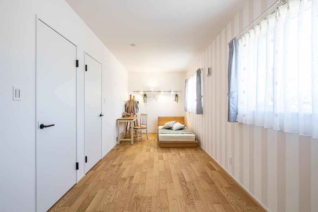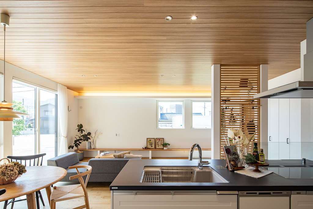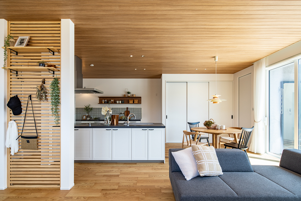 天井と床にあしらった木目が温かみを演出するLDK。大きな窓から自然光がたっぷり入り、家族がゆったり過ごせる開放的な空間です。