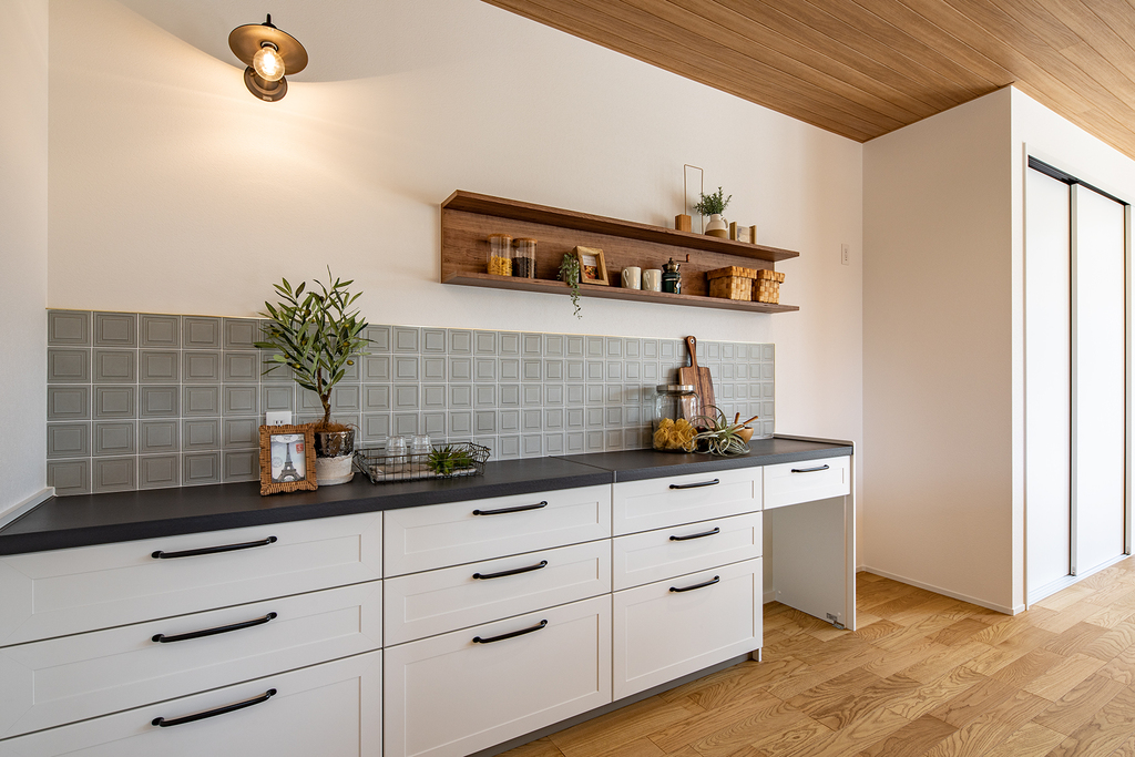 家事のしやすさを考えた一直線の動線設計。キッチンから洗面、浴室まで無駄なくつながり、洗濯や料理の同時進行もスムーズに。
