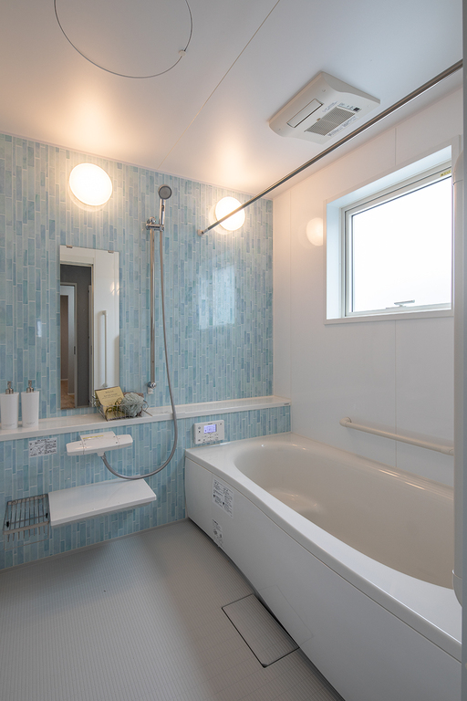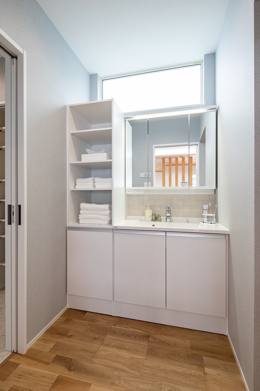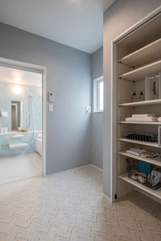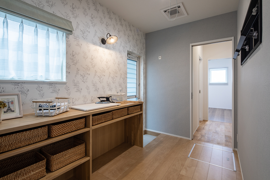キッチンからランドリースペース、バスルームへと繋がるように水周りをまとめることで、毎日の家事が一気に効率的に。さらにこのモデルハウスは、太陽光発電パネルと約1日分の電力を貯めておける大容量蓄電池を備えた「災害スマートハウス」仕様。停電時も慌てません。