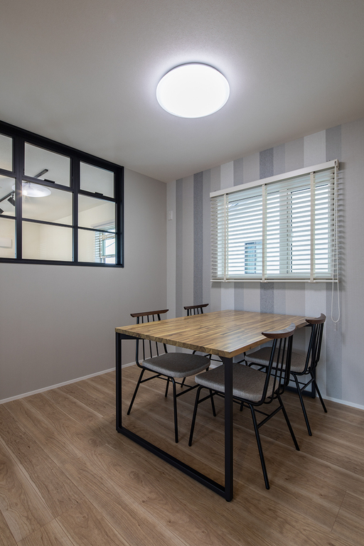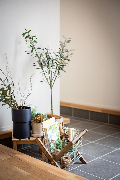 特徴的な長い土間。リビングやキッチンとの仕切りがなく、家の中なのに開放感に溢れています。そして何より嬉しいのは、ベビーカーやお気に入りの自転車もそのまま運び込めるところ。ガラス戸を開け放つとテラスに直結。セカンドリビングとしても使える大空間に早変わり。