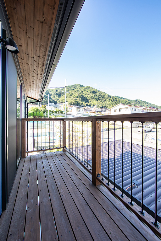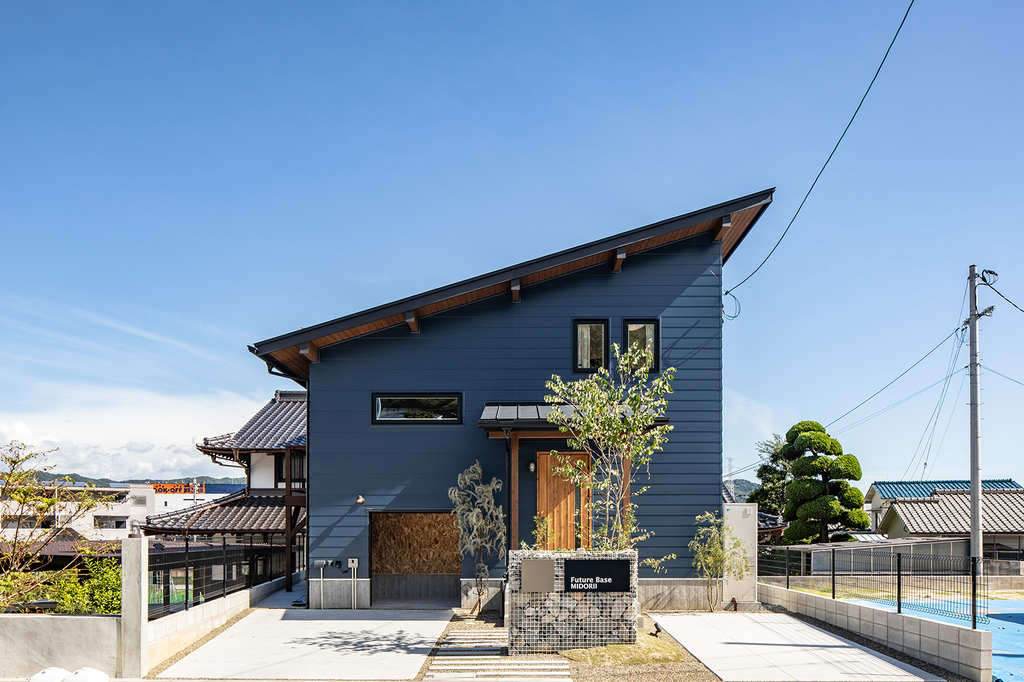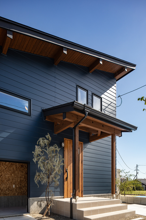 ネイビーの外壁、板張り軒天、アイアン手すりのウッドデッキなど、ワクワクする外観がお出迎え。
