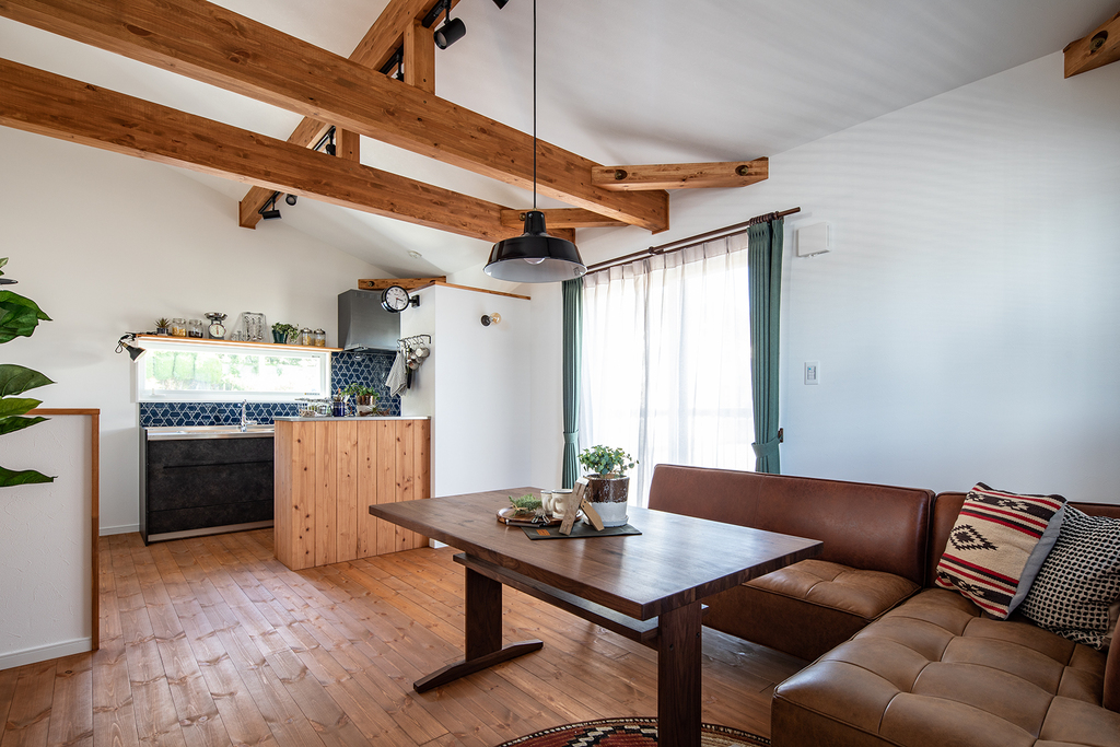 スキップフロアならではの、視界が広がる開放的なリビング。セカンドリビングと部屋を仕切る壁がないため、開放的で明るく感じられる空間に。ソファーダイニングにすることでより圧迫感を感じないインテリアのテクニックも必見です。
