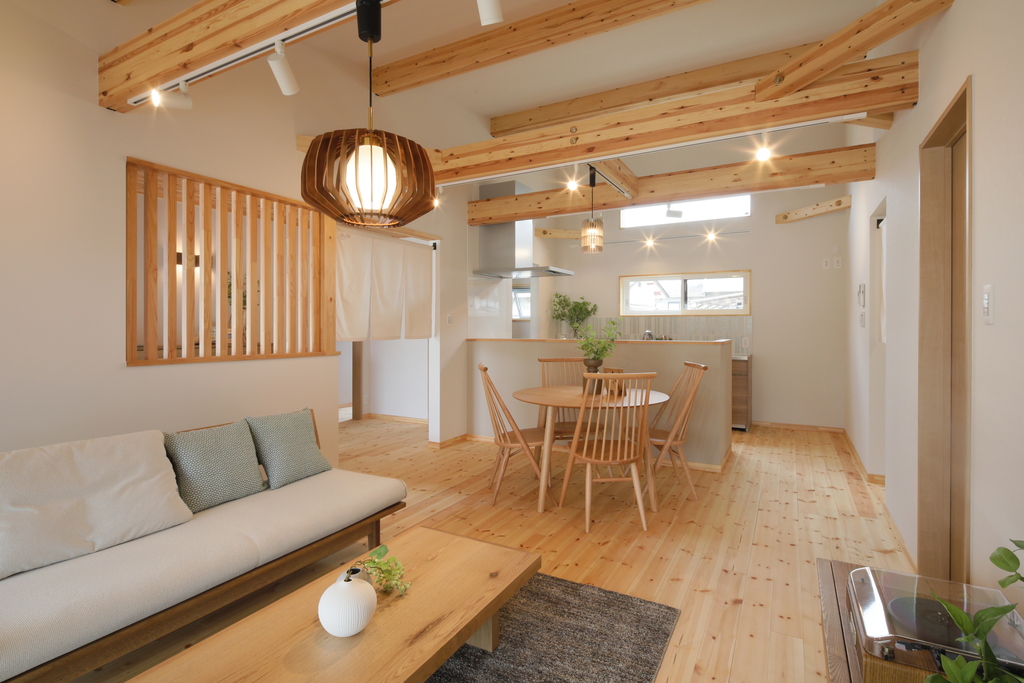 天井の梁と木格子が、自然素材の美しさを引き立て、毎日の暮らしに穏やかな余裕をもたらします。