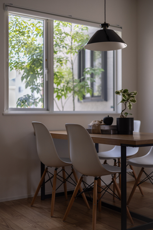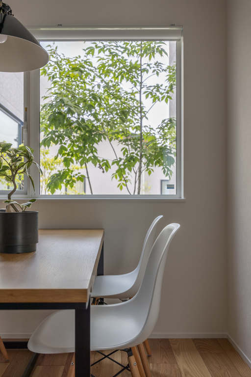 大きな窓から差し込むやわらかな光と、季節ごとに表情を変える庭の緑が、食卓の時間をよりゆたかに。