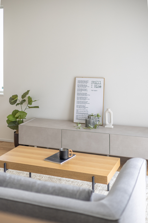 グレー×木目の落ち着いたトーンは、インテリアの組み合わせもしやすく長く愛せる空間です。