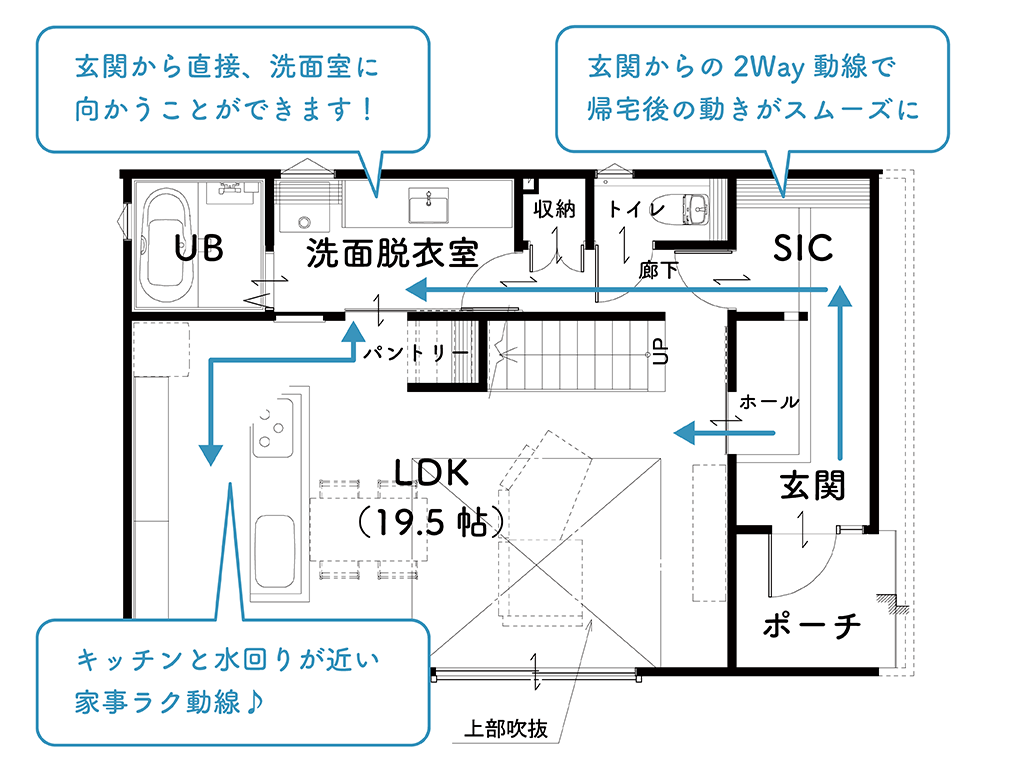 玄関からの2way動線により、帰宅後すぐに靴やコートを片付けることができ、そのままお風呂へ入ることもできます。また洗面脱衣所とキッチンが近いことで、炊事と洗濯を同時に進めやすく、家事が効率的に。