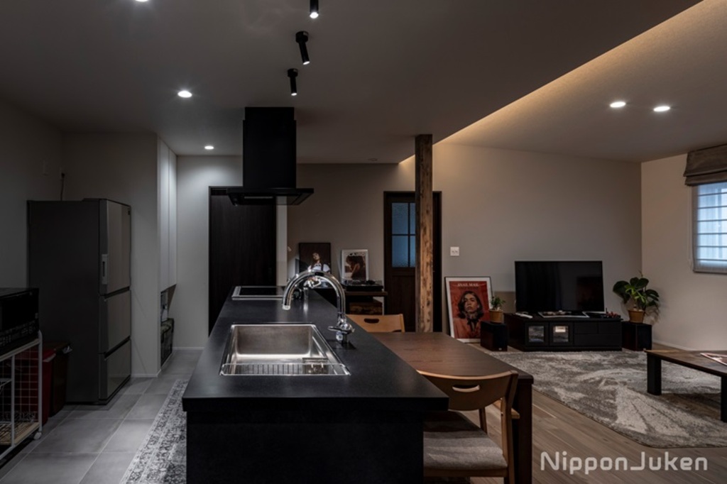 素材一つひとつの色合いや質感が空間に深みを与え、随所に灯された間接照明の柔らかな光と調和することで、住まい全体に高級感が漂います。