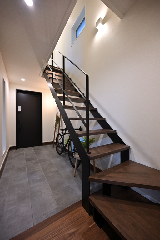玄関から入った瞬間、目に入るスタイリッシュな鉄骨階段