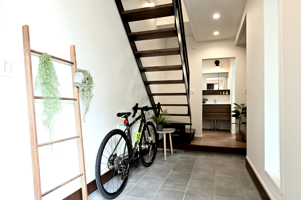 愛用の自転車を玄関に飾れる広い玄関ホール