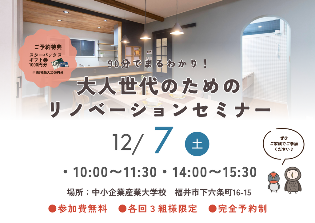 | タイトル | 90分でまるわかり!大人世代のためのリノベーションセミナー |