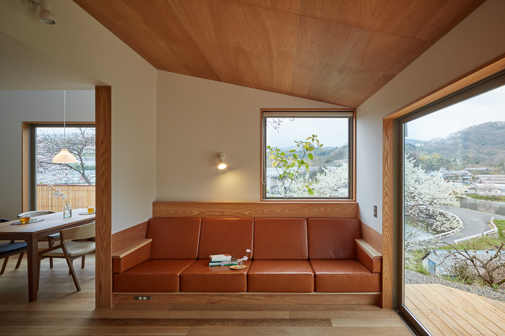 高天井でおおらかな空間に、さほらぼオリジナルの造作ソファーをつくりました。