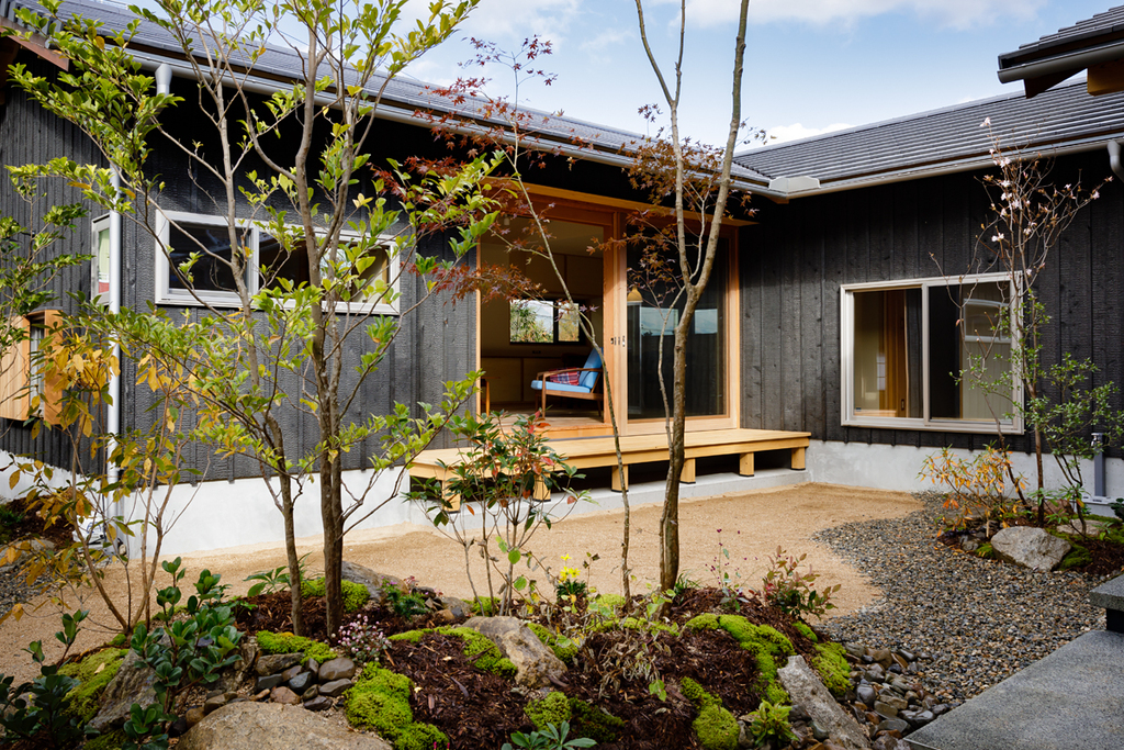 焼杉板を身にまとう優しい風合いの平屋ができました。