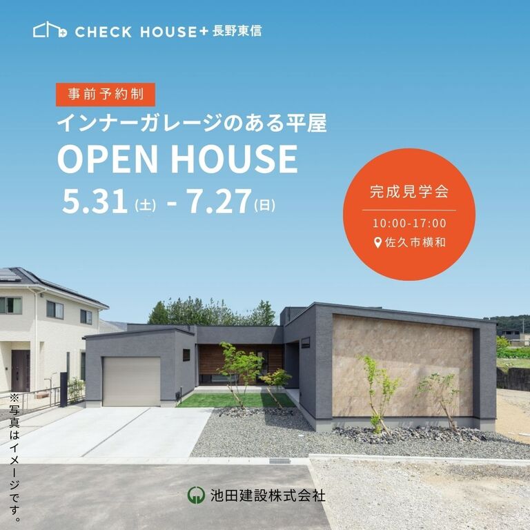 | タイトル | 佐久市5/31(土)-7/27(日) インナーガレージのある平屋 完成見学会 |