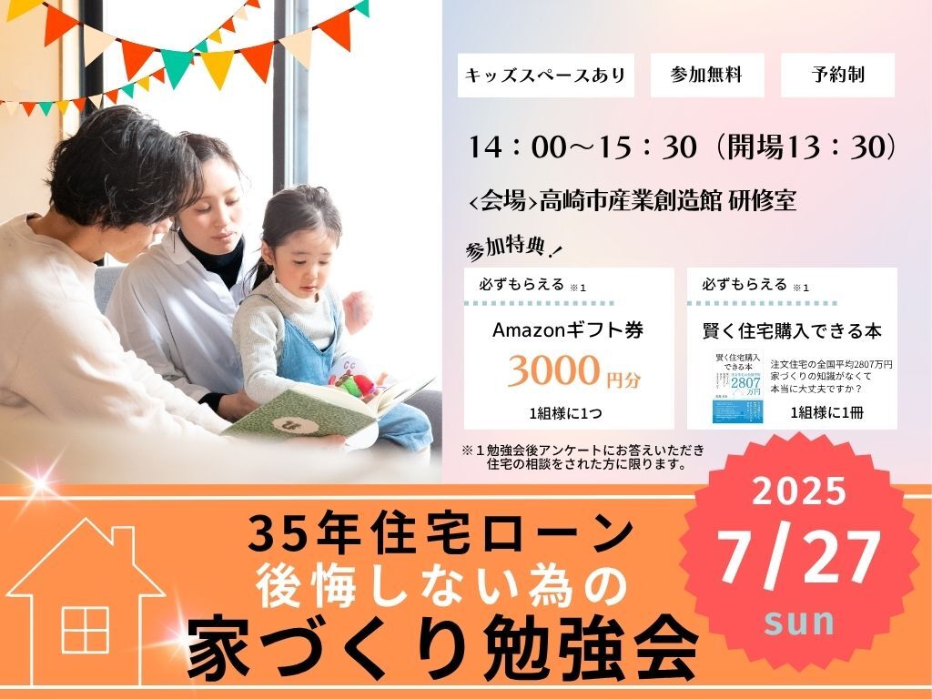 | タイトル | 7月27日(日) \夫婦で学ぶ/35年後も後悔しない為の家づくり勉強会 |