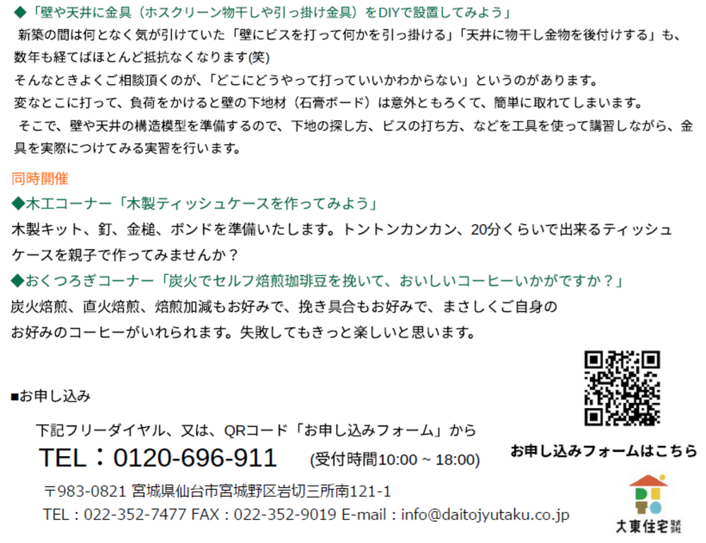 | タイトル | お手入れDIYイベント「壁下地探しと金具設置体験」「木工教室」「セルフ焙煎珈琲」同時開催 |