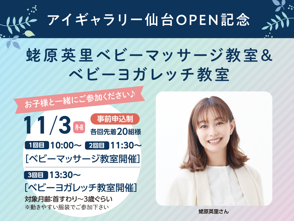 | タイトル | アイギャラリー仙台OPEN記念 11/3ベビーマッサージ教室&ベビーヨガレッチ教室 |