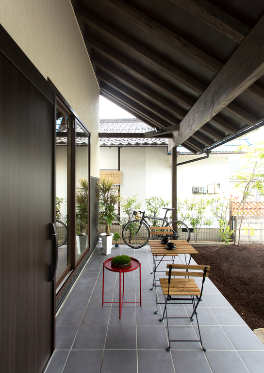 深い軒がのびたテラスに、ゆったりとした吹き抜けのリビング。