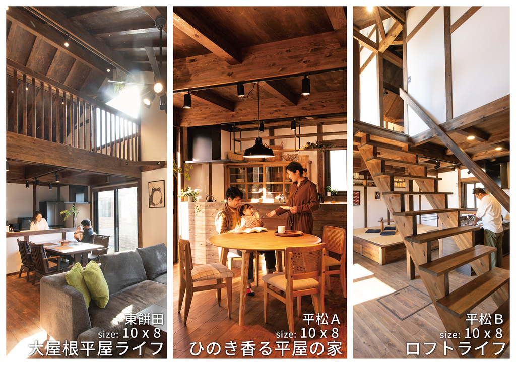 平屋、大屋根、ロフトタイプ、家族構成や暮らし方に合わせた住まいを、リアルに体感できます。