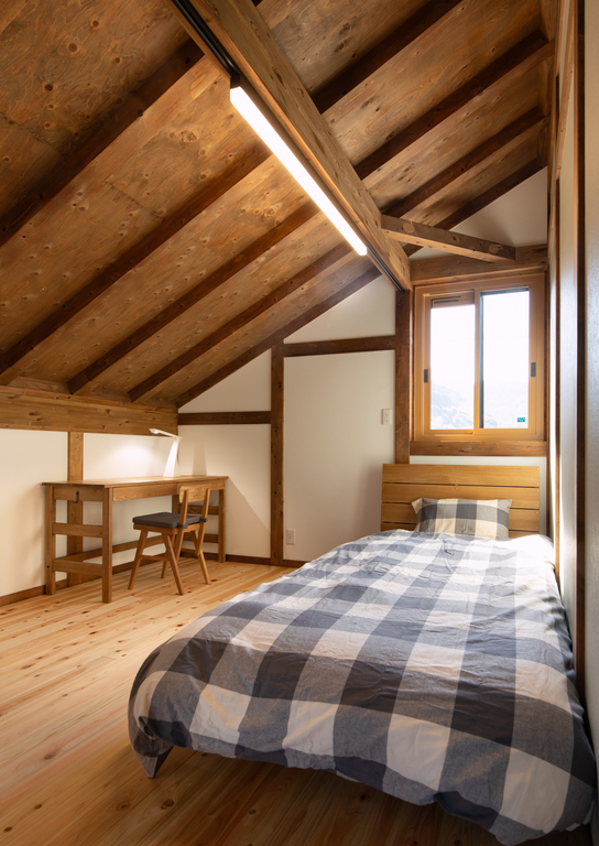 勾配天井を活かしたのびやかな子供部屋をご紹介します。開放感あふれる勾配天井は、まるで空に向かって手を伸ばすかのような自由な空間を創出します。また、大きな窓から入り込む自然光が、部屋全体を明るく照らし、心地よい環境を提供します。この部屋は、お子様の想像力を育む場所として最適です。風通しの良さと共に、生活に潤いをもたらします。