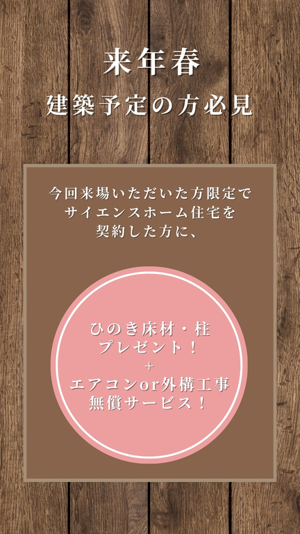 (For attendees of this event only, when building a home: Receive hinoki flooring and pillars as a gift! Free air conditioning or landscaping services! Value of approximately 300,000 yen.)