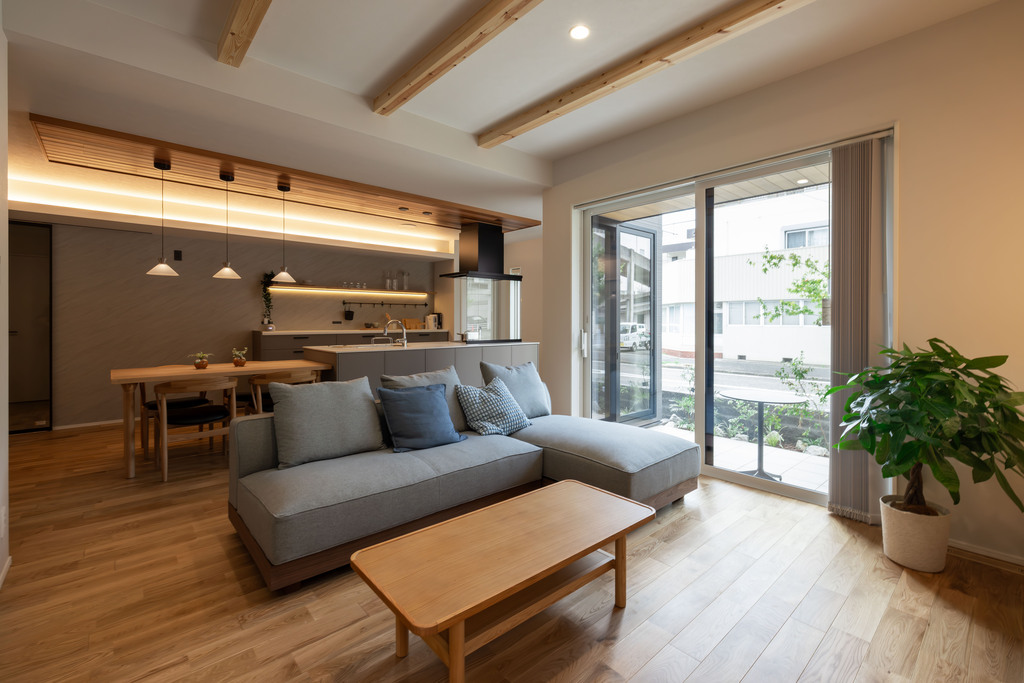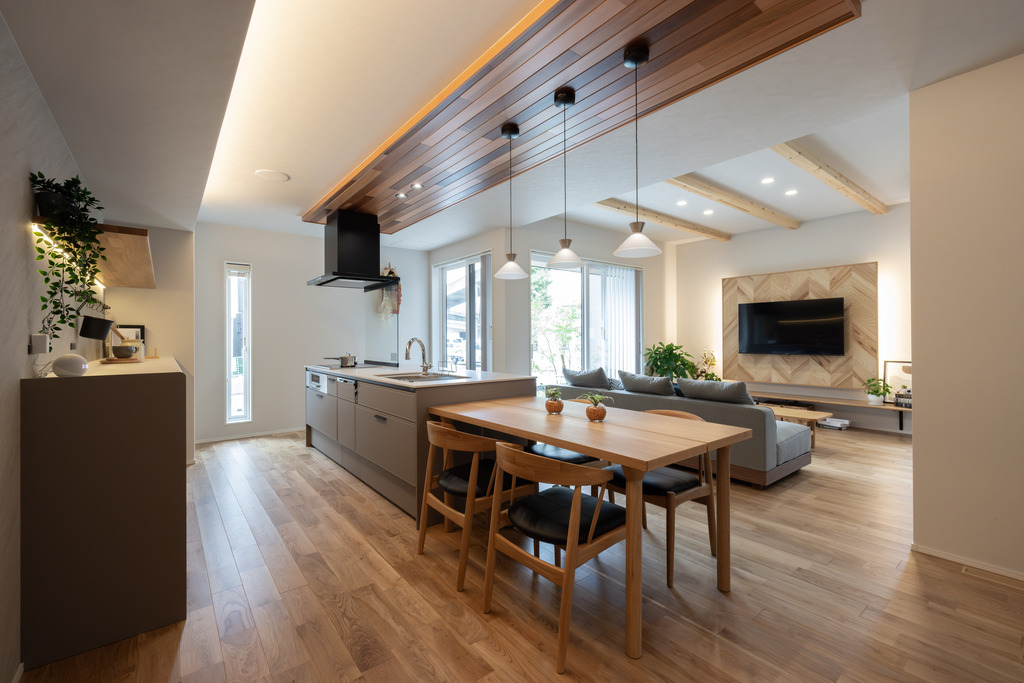 ・家族団らんの時間を過ごすリビングは梁見せ天井