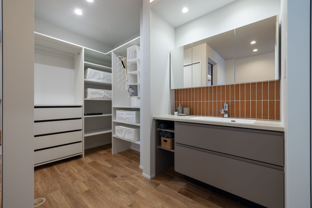 ・家事が楽になるように水廻りをまとめたプランニング。・脱衣所と洗面所を分け、より快適で機能的な空間に。