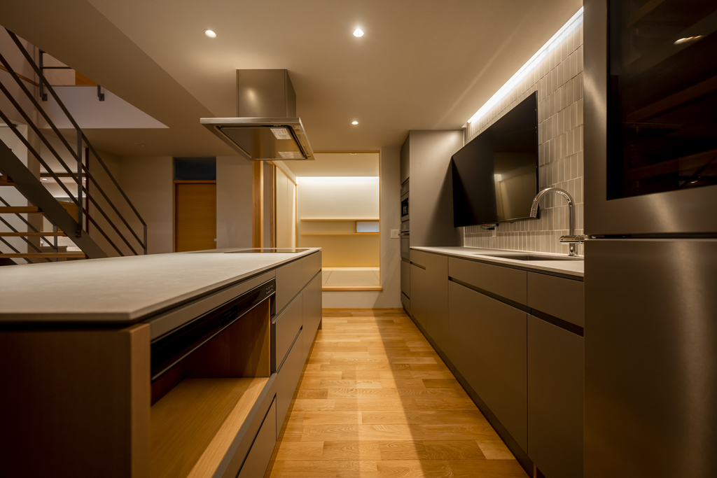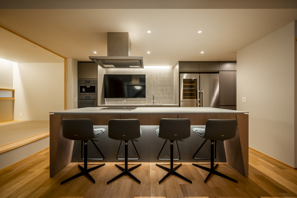 厳選された素材で構築された、ジャパンメイドのこだわりの家具やキッチンを提供する『クチーナ』とコラボレーション。ゲストを招くことを前提にブランドにオーダーしたキッチンは、スポーツバーのように寛ぎながら過ごせる大胆な空間構成が魅力。また、主寝室と隣り合うクロークは、TPOや季節に応じたご夫婦の洋服を収納することを見据えた大容量。『クチーナ』ブランドならではの繊細な配慮が行き届いたクロークは、毎日のコーディネートが愉しくなる仕上がりです。