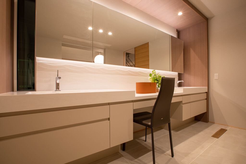 ヨガやトレーニングは、もはや生活の一部になっている方も多いのでは。健やかな身体を保つために必要なスペースを、自宅に設けてしまえばストレスフリーに続けられるはずです。『クチーナ』プロデュースのパウダールームは、2ボウルの洗面台をはじめ、空間の中央に設置するのは冷蔵庫。トレーニング後の水分補給に欠かせないドリンクや、バスタイムの後にキュッと肌を引き締めてくれる化粧水を忍ばせたら、思う存分“美”を磨きたい。