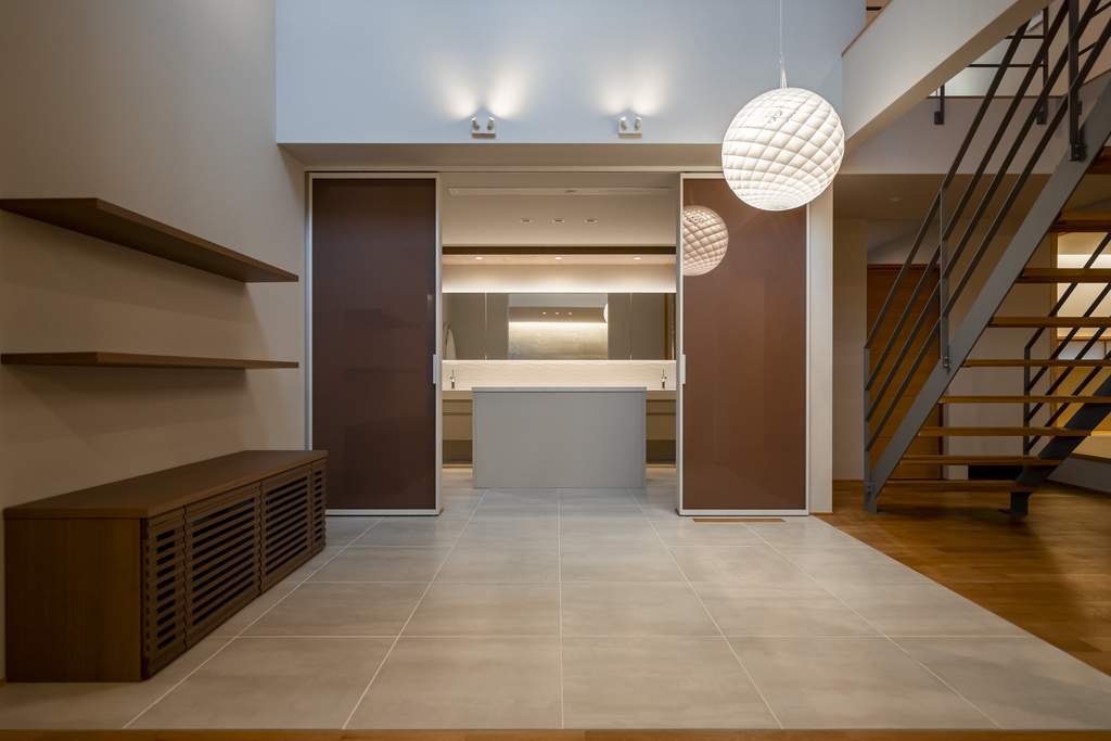 開口部が広く、大型のSUVが2台ゆったりと駐車できるガレージを併設。ガレージにはシャッターを設置しているため、防犯性が高く、車をいたずらや盗難から守ります。また、ボディの色あせ、ヘッドライトの黄ばみなどの原因である紫外線からも愛車を守るため、愛車の劣化対策にも有効です。ガレージから玄関へはポーチを通じてアクセスできるので雨の日などの外出時も安心です。