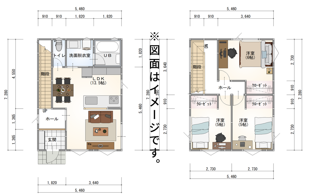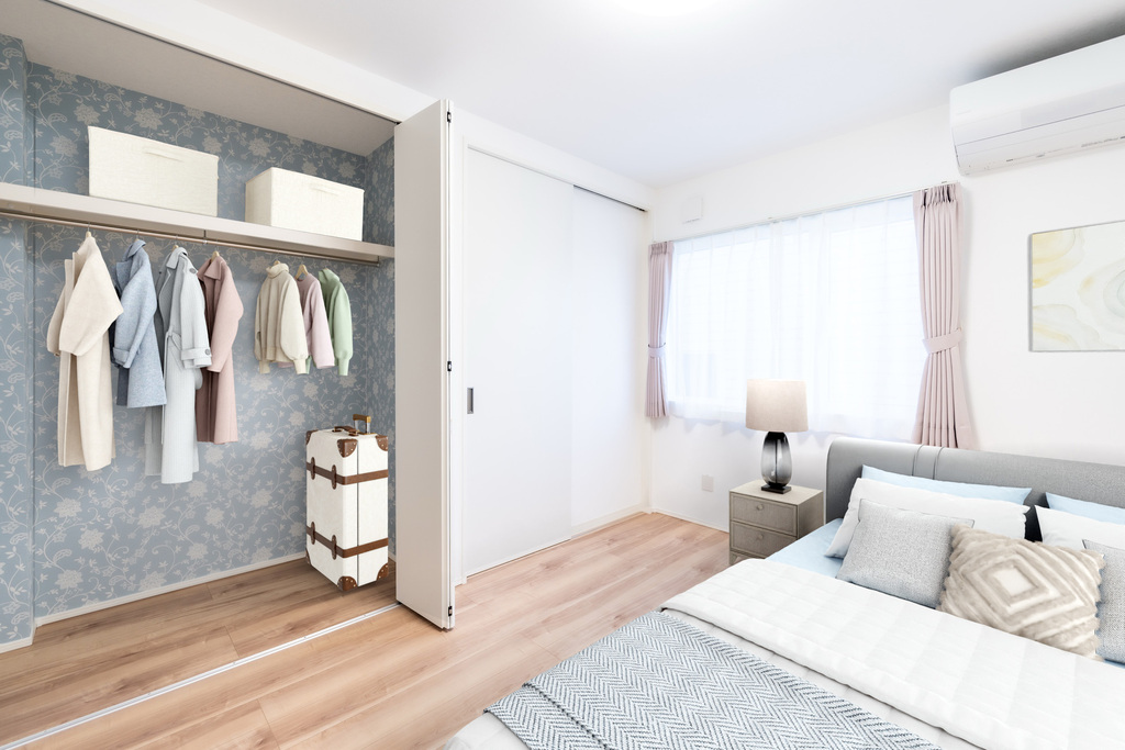 2階には**子供室が2部屋独立して設けられており、兄弟・姉妹がそれぞれの空間でのびのびと過ごせる設計です。各部屋は適度なプライベート感を確保しながら、自然につながるファミリーライクな配置になっています。さらに2階ホールに隣接するウォークインクローゼット(WIC)は、家族全員の衣類や季節用品をまとめて収納できる大容量スペース。各部屋に収納が分散せず、家族共有の収納として一括管理できるため、衣替えや整理整頓がぐっとラクになります。