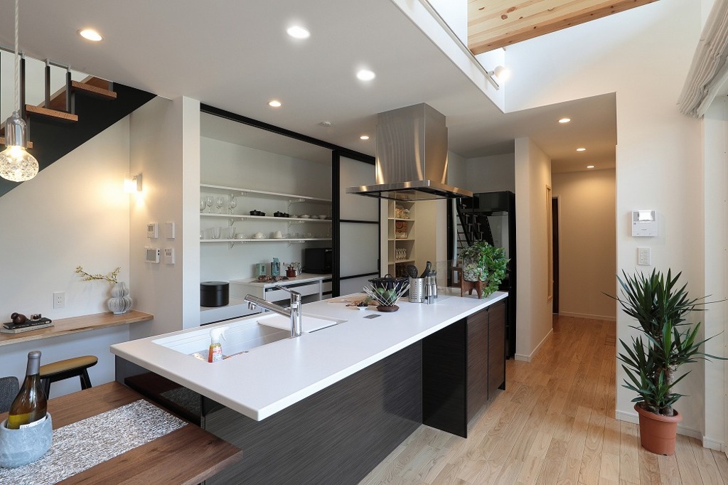 キッチンが家の中心にあり、家族がどこにいても共有できる空間でダイニングはもちろん、段下がりリビング、畳スペース、中庭まで見渡せます。照明からは音楽が流れたり、最新のスマートハウスアイテムも満載です。