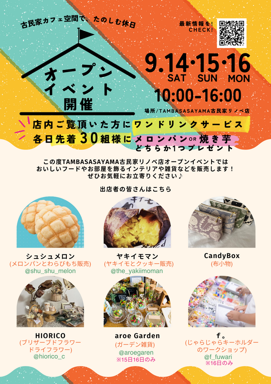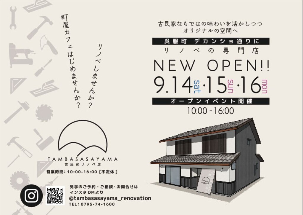| タイトル | 【9月14・15・16日開催】TAMBASASAYAMA古民家リノベ店オープンイベント |