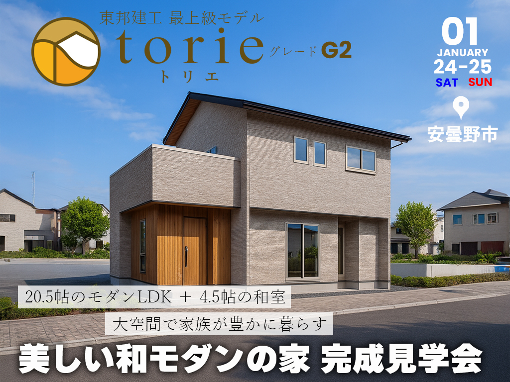 この住まいは、高い省エネ性能で環境と家計に優しい「GX志向型住宅」です。東邦建工の最高峰モデル「torie」のG2グレード(断熱等級6)の断熱性能により、25帖の大空間でも熱を逃さずしっかりキープ。少ない冷暖房エネルギーで家中を暖かく保てるため、光熱費の抑制にもつながります。1月の厳しい寒さの中でこそ実感できる、未来基準の快適さと暖かさをぜひご体感ください。