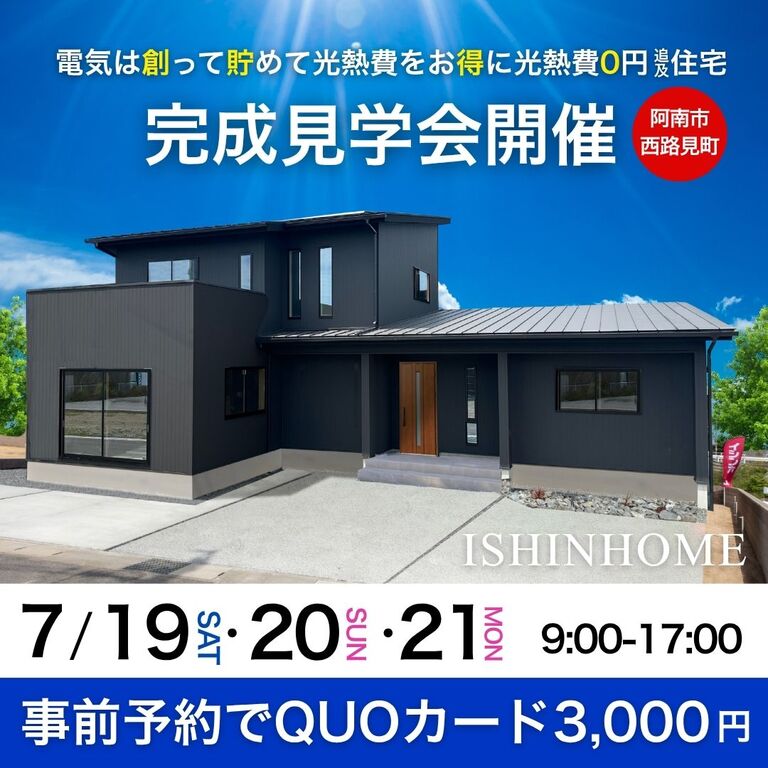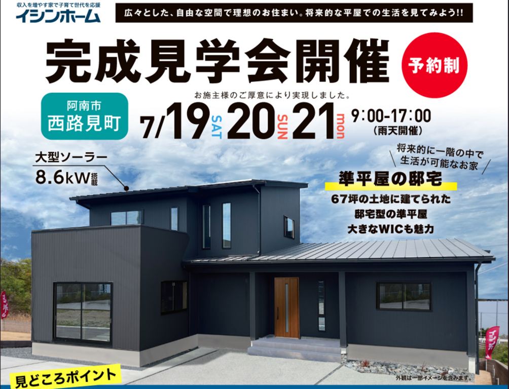 | タイトル | 7/19(土)~21(祝)「準平屋の邸宅」完成見学会開催 in 阿南市西路見町 |