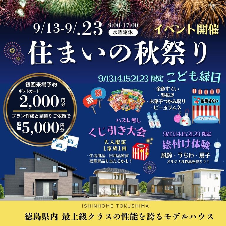| タイトル | 9/13(土)~9/23(祝) 住まいの秋祭りイベント開催!inモデルハウス |