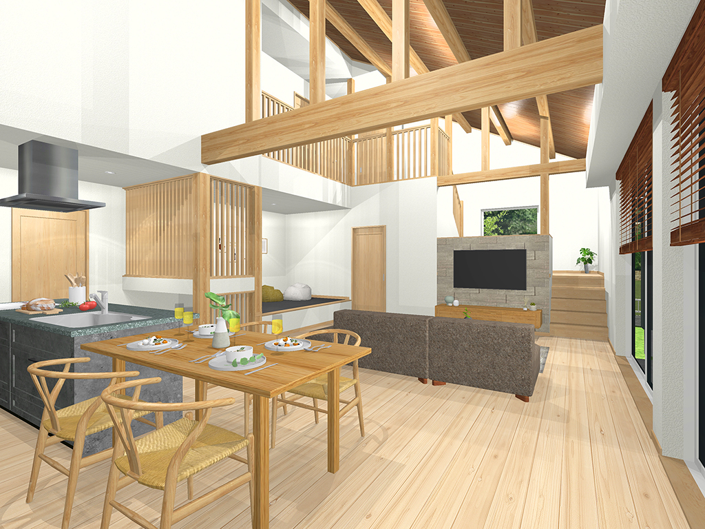 1. 勾配天井が広がる開放感あふれるリビングダイニング