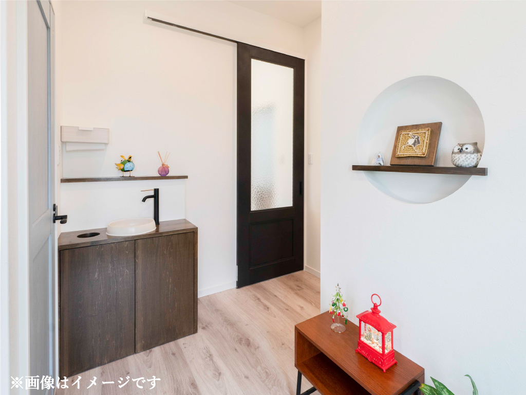 玄関からスムーズに水回りへアクセスできる動線設計。忙しい毎日の中で、利便性と快適さを重視した機能的な空間。