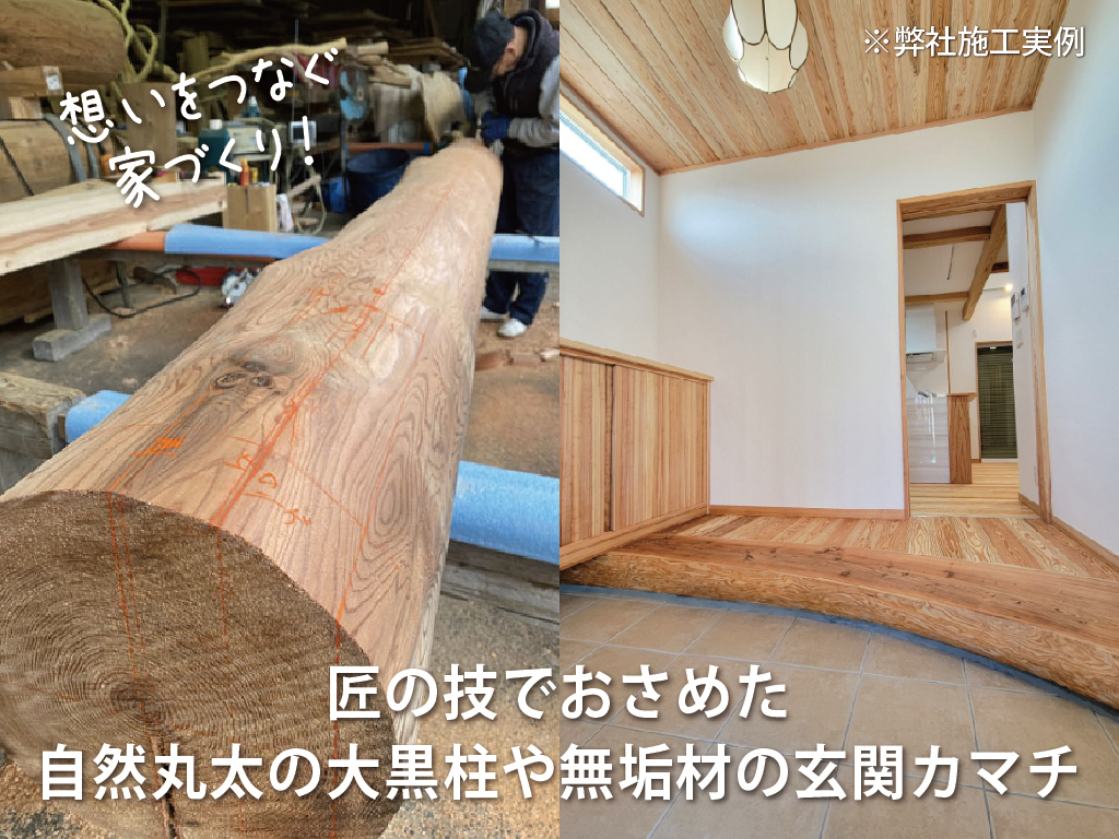 7 匠の技でおさめた 大黒柱 や 大梁材、無垢材の玄関カマチ