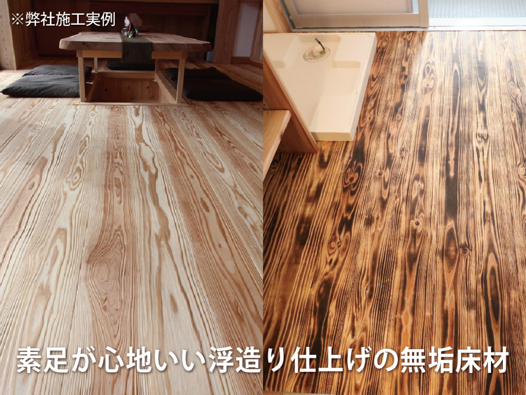 6 家族が集うLDKには一年中素足が心地いい 浮造り仕上げの杉床板、脱衣室には 水に強い焼杉の無垢床材