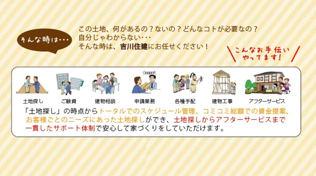 コミコミ総額での資金提案、お客様ごとのニーズにあった土地探しができ、土地探しからアフターサービスまで一貫したサポート体制で安心して家づくりをしていただけます。