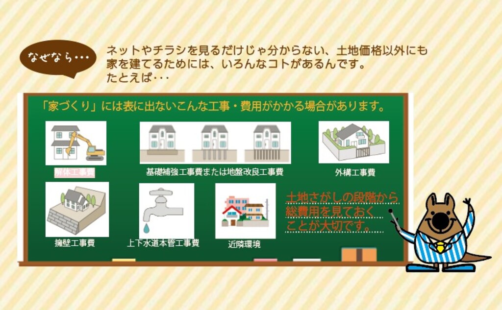 なぜなら・・・ネットやチラシを見るだけじゃ分からない、土地価格以外にも家を建てるためには、いろんなコトがあるんです。