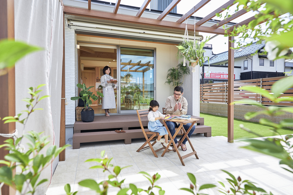 庭・ウッドデッキ・リビングがつながる陽が差し込む南面のくつろぎ空間