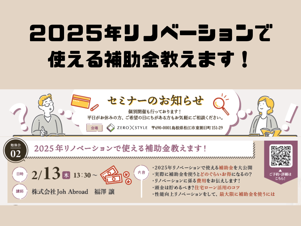 タイトル | 【セミナー】2025年リノベーションで使える補助金教えます! |
